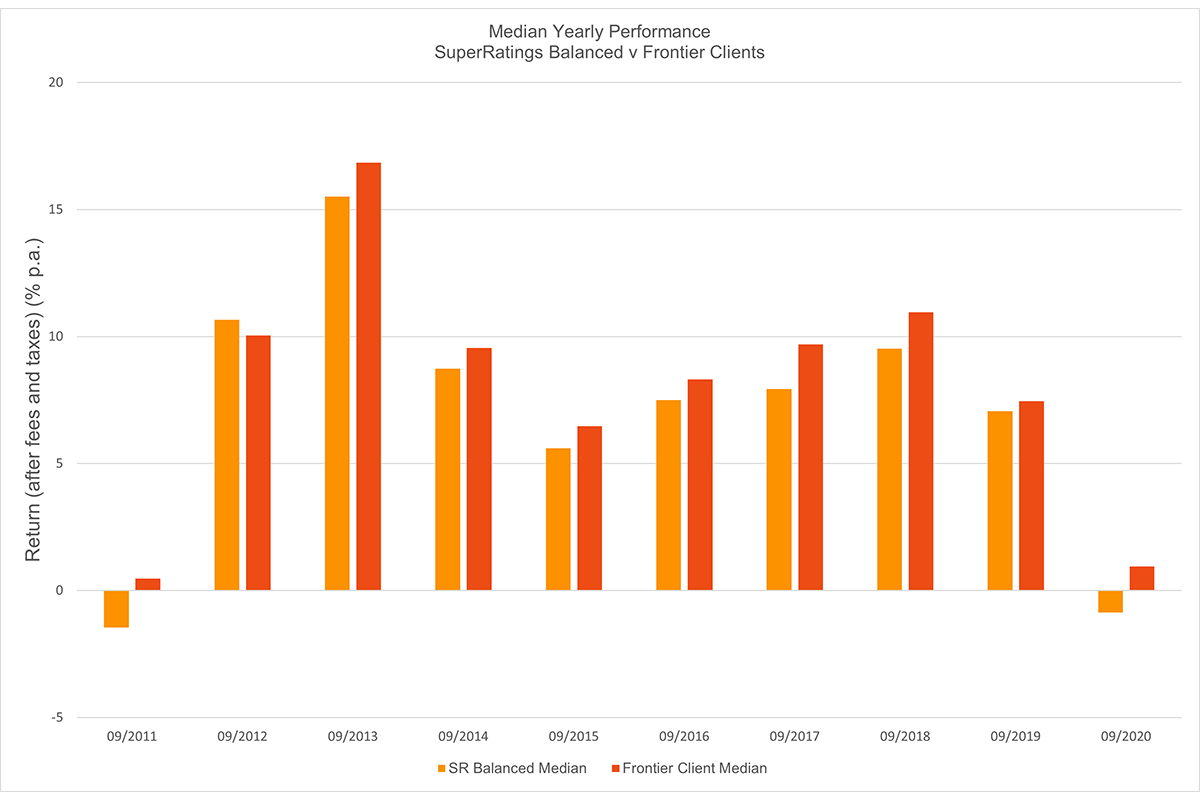In nine out of ten years Frontier clients, in aggregate, have outperformed the median fund. This shows consistent outperformance, however, it is over the long-term, the most critical metric to be judged against, where our results demonstrate noticeably superior outcomes. For example, over the five years to 30 September 2020, our median client added an extra 1.2% per annum over the median fund.